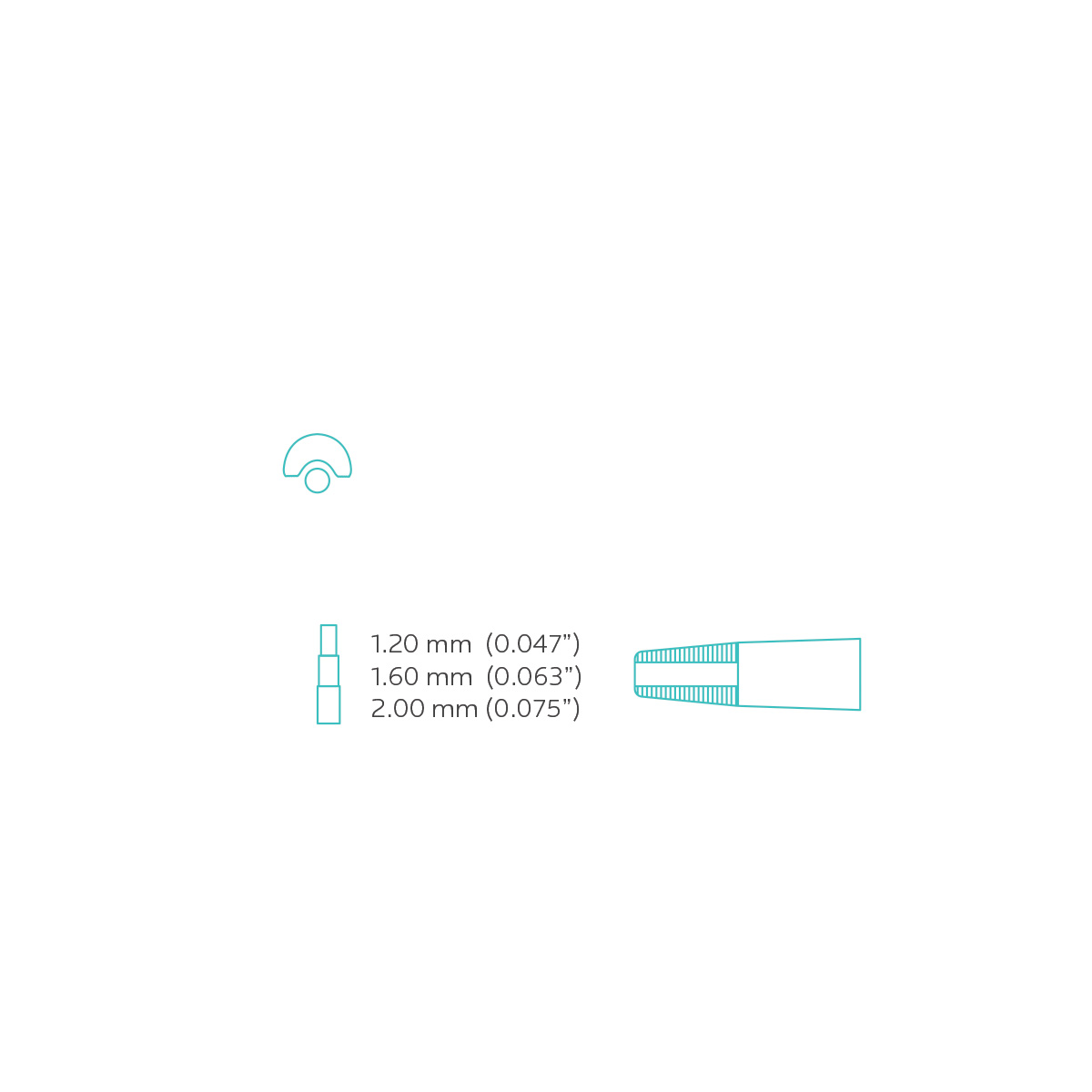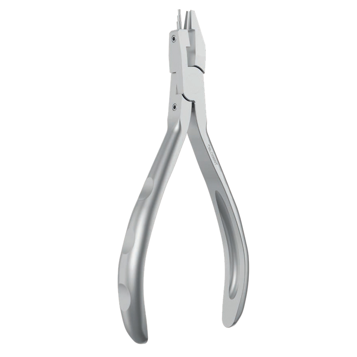 Loop-forming pliers for round and rectangular wires, with a replaceable cylindrical beak. The concave beak with parallel serrations firmly holds the wire in position. Wire size: max. 0.70 mm (0.028”)